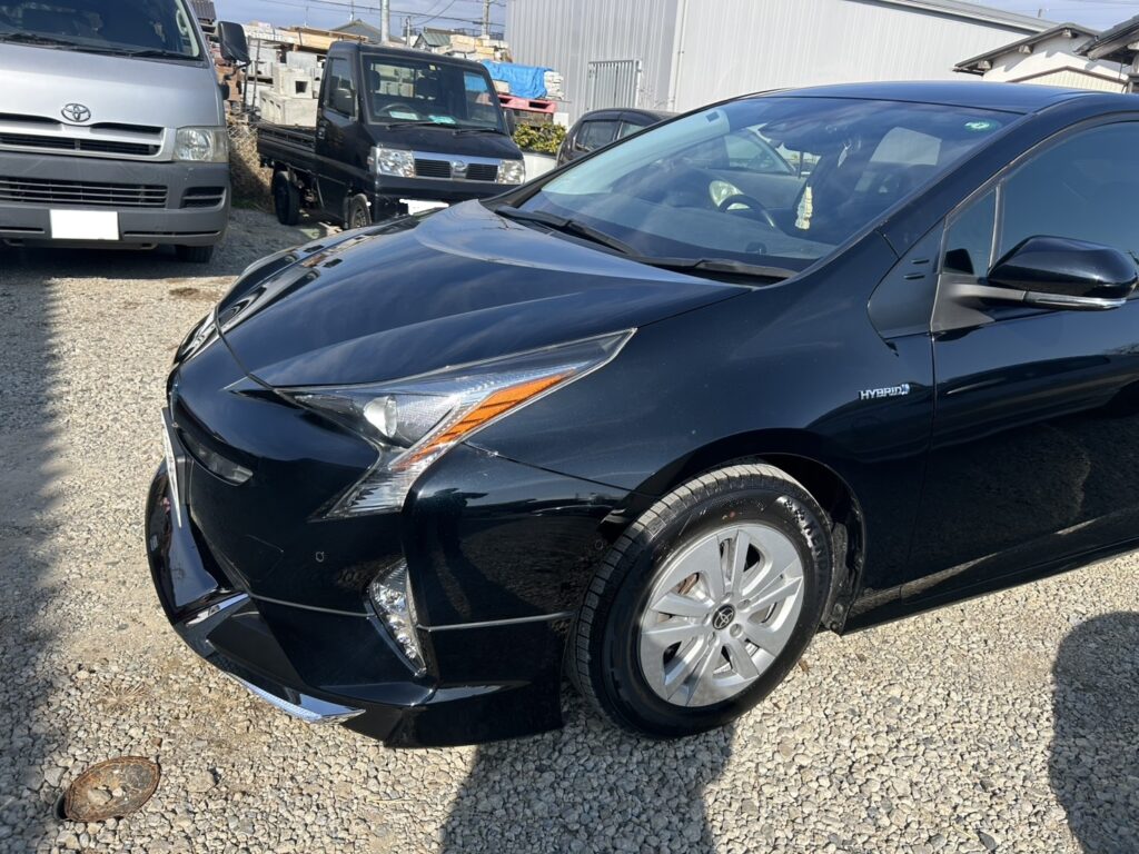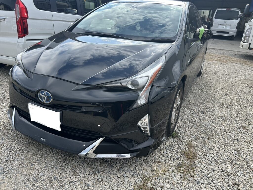 二車線道路での接触事故により、左側面に広範囲な損傷を受けたプリウスの修理事例です。過失割合(当方1:相手9)が絡む保険適用の案件として承りました。